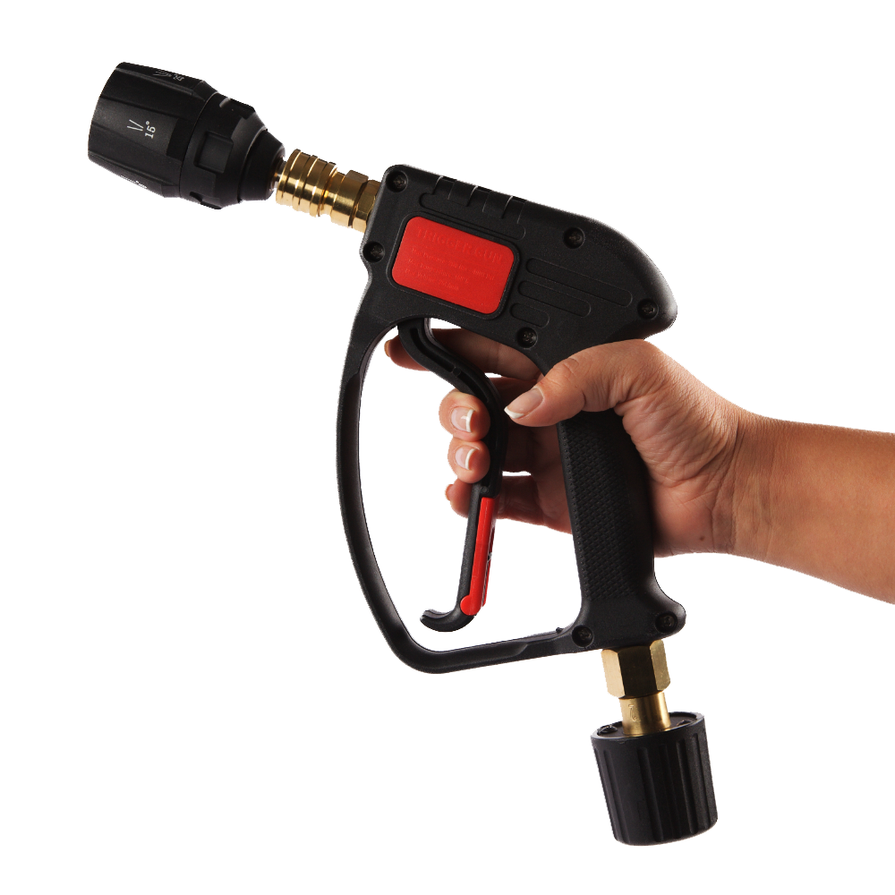 Med vores Auto Glanz Pistolgreb, kan du gevaldigt opgradere oplevelsen brugen af din højtryksrenser. Pistolgrebet er super kort, hvilket øger din kontrol og gør det nemmere at spule steder du normalt ikke kommer ordentlig til med højtryksrenserens originale greb. Pistolgrebet har en roterbar svirvel, hvilket minimerer at højtryksslangen krøller sig sammen. Aftrækkeren kører friktionsløst og lækkert og så medfølger en særlig "5 i 1" dyse, hvori du kan justere strålens spredning i 5 forskellige grader (!) Pistolgrebet benytter quick-release systemet, hvorfor den er kompatibelt med alt tilbehør som benytter denne standard. Pistolen er "Plug & Play" med Nilfisk C, D, E samt Core Modeller - ligesom den kan benyttes med Bigboi WashR Flo.