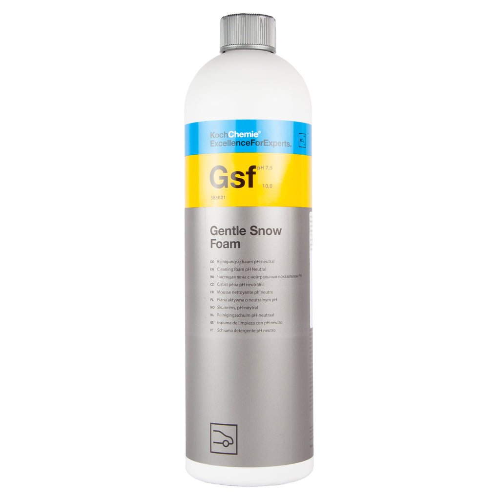Gentle Snow Foam fra Koch Chemie er et kombineret vaskeshampoo og forvaskeprodukt, som du både kan bruge i din skumlanse og i din vaskespand. Produktet er ph-neutralt, så det spiser lige ud af boksen ikke din lakbeskyttelse. I skumlansen laver den en flot skum med fin vedhæftningsevne, som du kan vaske direkte oven i hvis du ønsker dette. Modsat bruger du den i din vaskespand vil du opnå masser af glidemiddel hvilket nedsætter friktionen mellem vaskemedie og lak. Modsat mange andre produkter, spules den let af lakken igen. Dvs. den bliver ikke ved med at skumme op, når den rammes af højt vandtryk. Ønsker du det, kan du tilsætte en lille smule Green Star APC sammen med Gentle Snow Foam i din skumlanse og herved gøre produktet “aktivt”. Har en sød duft af kirsebær .
