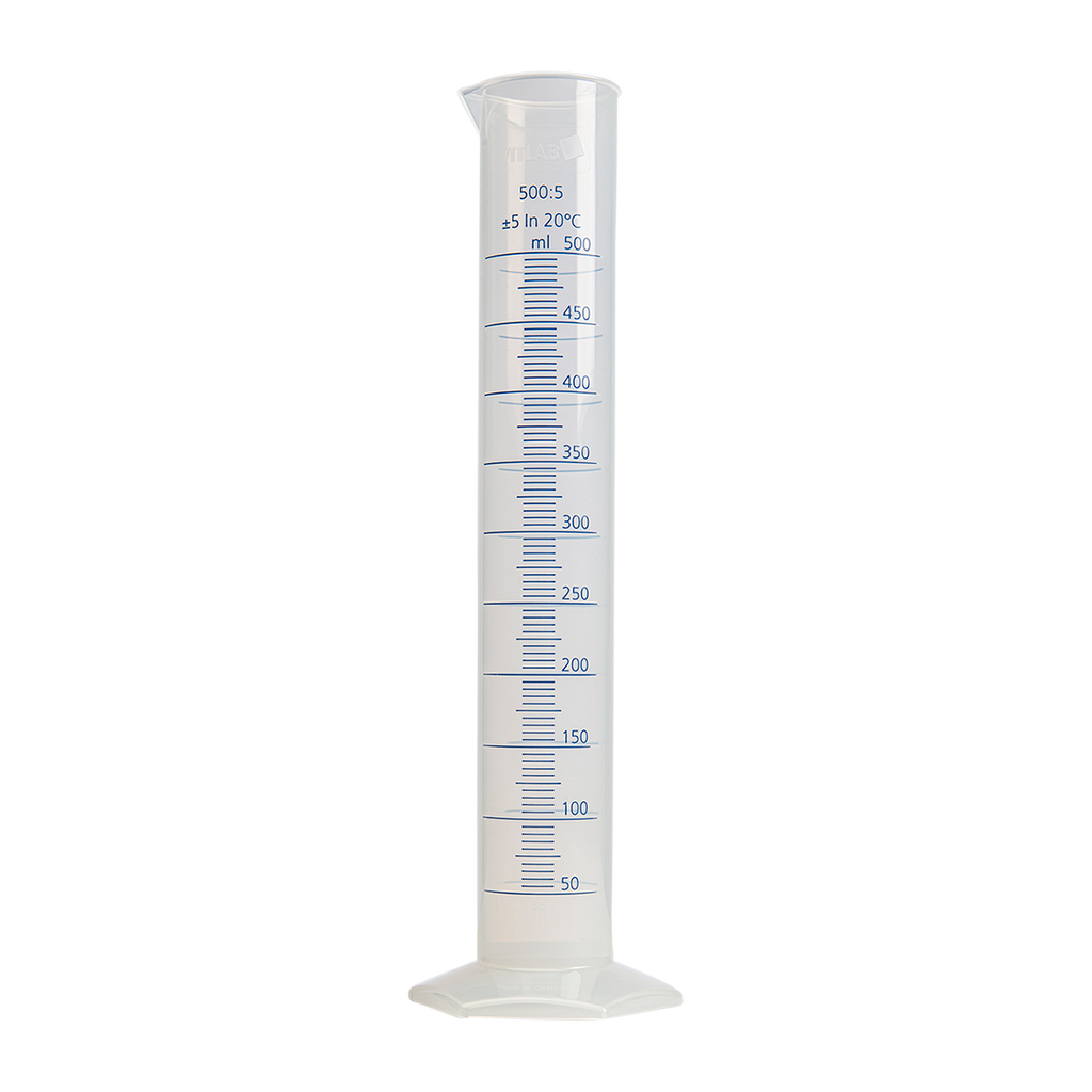 Cylinderen er transparant med afmærkning fra 50-500 ml med 10 ml intervaller.