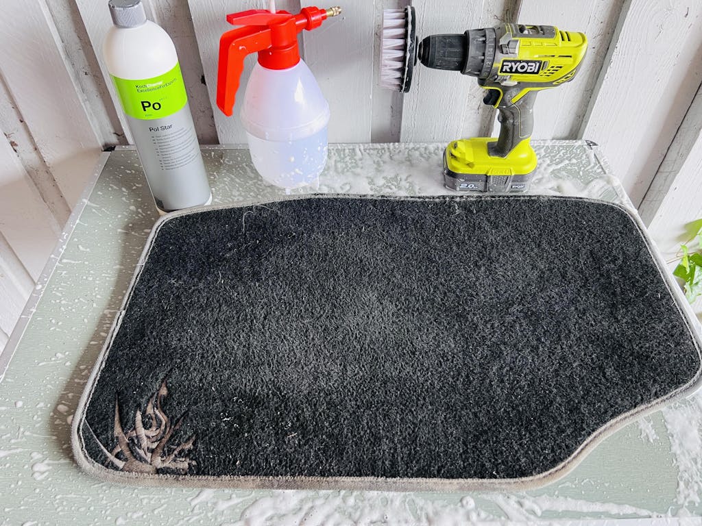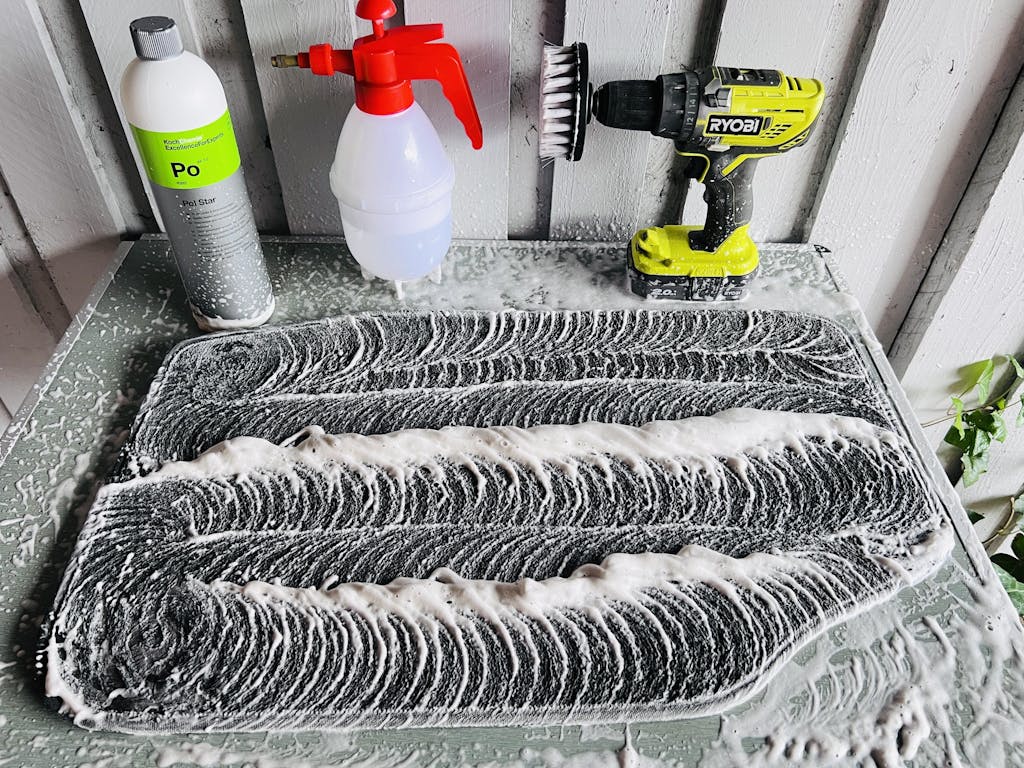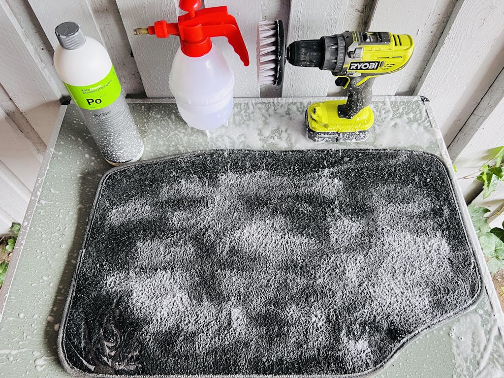 cirka mellem ti og 20 ml produkt cirka 800 ml vand skummer rigtig godt og mere produkt man sprøjter på jo mere vil den skumme men når man så skal af produktet af måtterne er der meget produkt tilbage så det tager lidt tid om at få produktet ud af måtterne men det er bare en justering synd at duften ikke er stærkere skulder resten af produktet af med en højtryksrensere og bagefter støvsuger jeg vandet op Og så slut sprøjter jeg et produkt der går ind og dræber de sidste bakterier og giver en god duft