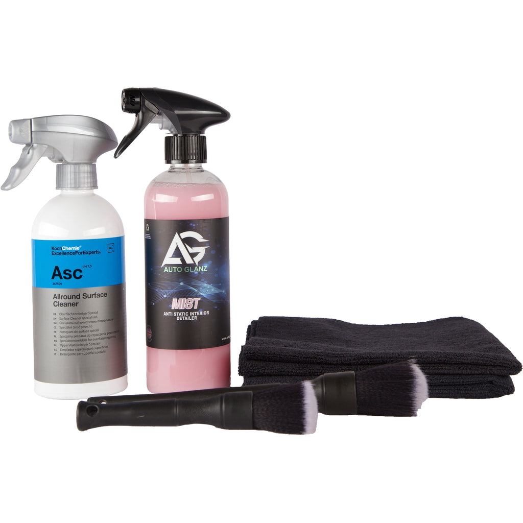 Start med at påføre Koch Chemie Allround Surface Cleaner på de overflader, du ønsker at rengøre. Interiørrensen rengører effektivt og fjerner samtidig bakterier for et hygiejnisk resultat. Tør efter med de sorte microfiber klude for et strålende resultat. Brug detailing penslerne til ventilationshuller, knapper og andre svært tilgængelige steder. Afslut med Auto Glanz Mist på alle hårde overflader - den giver UV-beskyttelse og antistatisk effekt, så støvet er nemmere at fjerne igen næste gang.