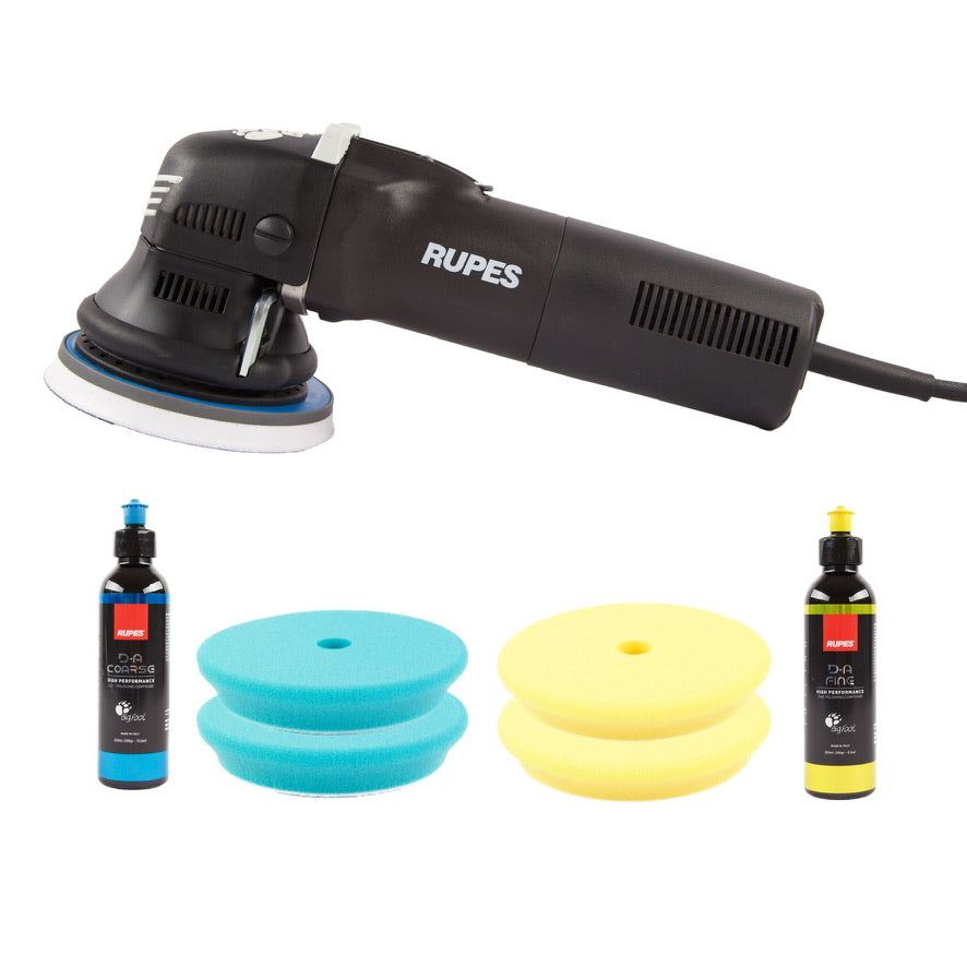Med denne poleringspakke får du den populære og super kompakte Duetto dual action polermaskine med 5¨ bagskive og 12 mm udsving, sammen med 2 forskellige Rupes pads og polermidler. Pakken er et såkaldt 2-trins pakke, så du både for mulighed for at lave ridsefjernelse og efterfølgende polere lakken blank. Sættet er et godt startsæt, som du senere kan bygge på med flere typer polerskiver/polermidler og evnt en mindre maskine som supplement.