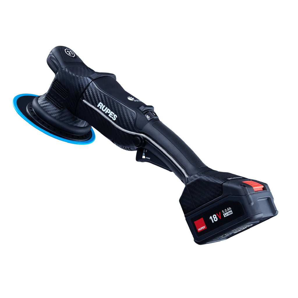 Når du har et batteri på en polermaskine, kan det komme til at være lidt i vejen. Rupes har løst dette ved at vinkle det en smule, samt påføre et gummibånd i bunden af batteriet. Så kommer batteriet til at ramme lakken, sker der ikke noget.