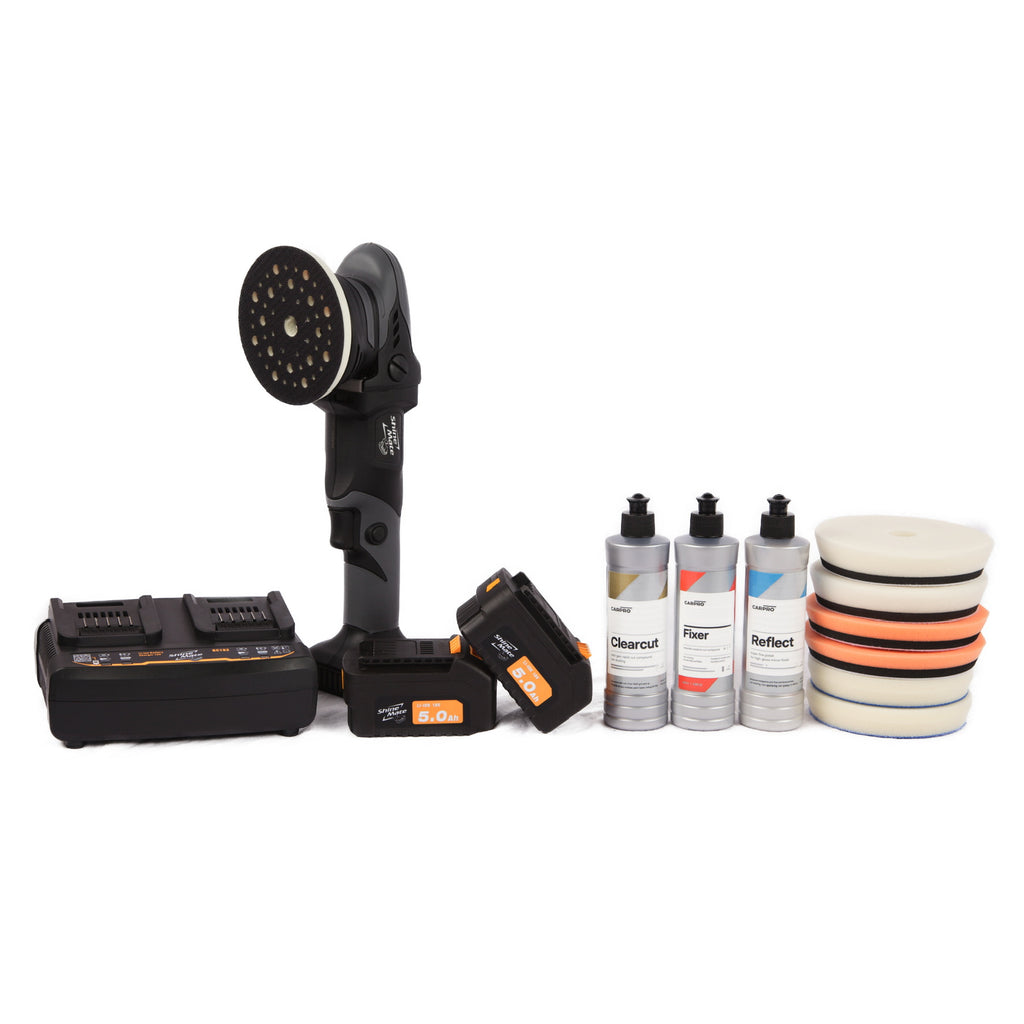 I pakken her, kan du vælge mellem den lækre batteridrevet EB315 Dual Action polermaskine med 15 mm udsving og 5¨ bagskive, eller dens søstermaskine EX610 på ledning med ditto specifikationer.