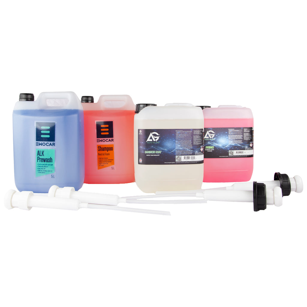 Dette komplette kemisæt giver dig 20 liter premium vaskekemi plus 4 praktiske pumper til præcis dosering. Perfekt til dig der vasker ofte, eller ønsker at spare stort ved at købe i bulk.